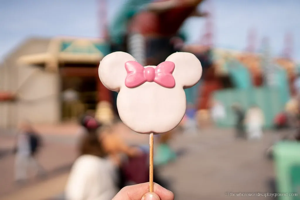 This chocolate-covered cake pop with its marshmallow ears is delicious and one of our favourite snacks in Disneyland Paris. It is chocolate dipped in chocolate with a marshmallow bite!