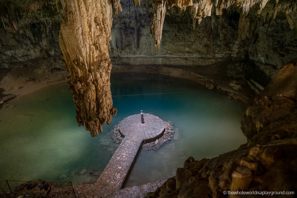 Playa Del Carmen Cenotes tip: For most of the Playa Del Carmen Cenotes we recommend an early or late visit as the best way to avoid the crowds. However, the light beams at Cenote Suytun mean that a late morning/afternoon visit is best – this is when the light beams are most likely to shine directly onto the circular platform, a magical experience. The afternoons at Cenote Suytun can be busy with tour buses but sometimes busy can be best!