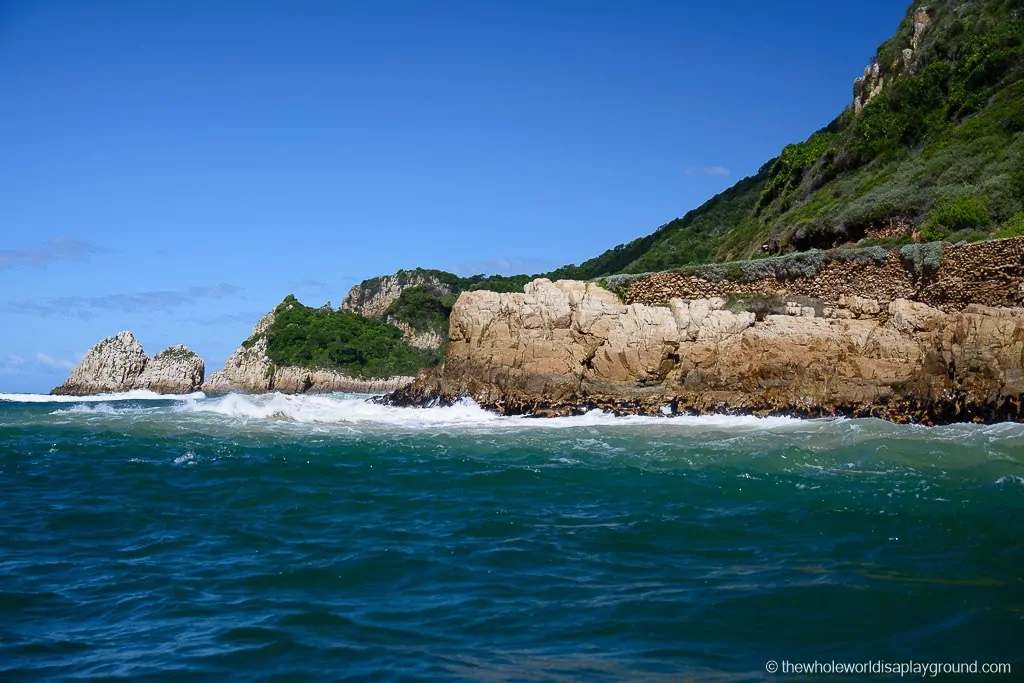 Knysna, a waterfront town along the Garden Route, is a gorgeous base for one night to check out the Knysna Heads. The Knysna Heads are two imposing sea cliffs that protect the entrance to the Knysna lagoon from the unrelenting Indian Ocean. Despite our sea drenching from a bumpy boat ride to the Heads it was spectacular to watch the sea thrash through the narrow gap and drink in the stunning scenery.