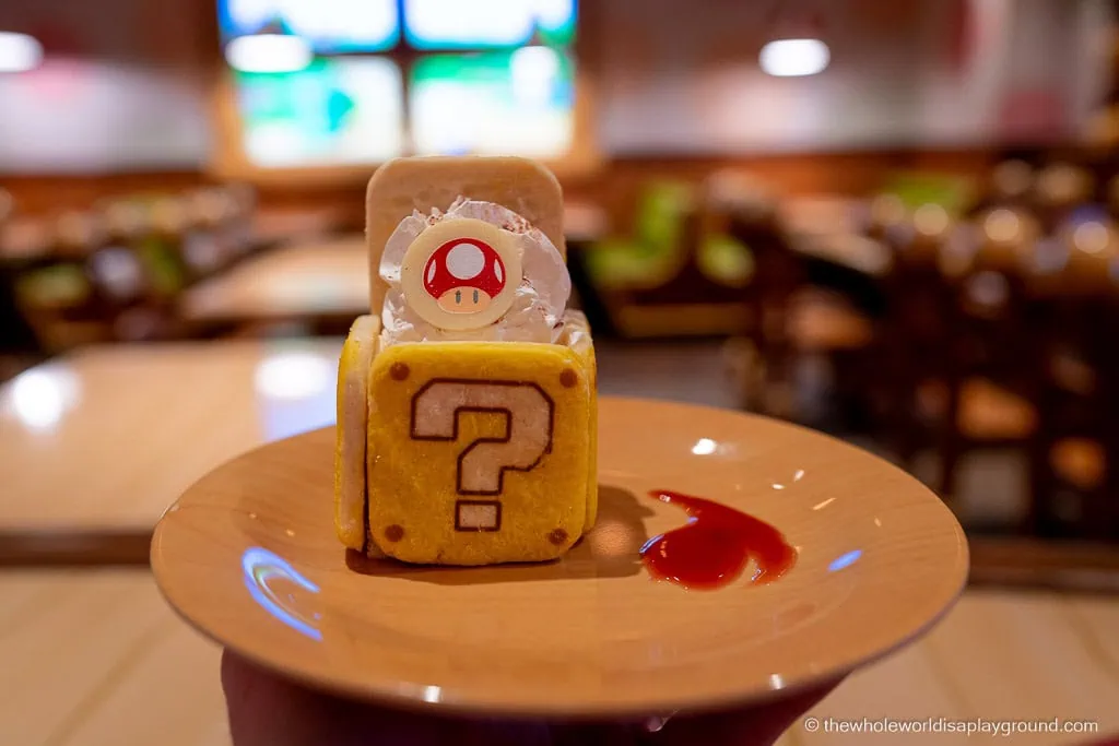 ? Block Tiramisu: Tiramisu layered with coffee-flavored sponge fingers topped with a chocolate power-up. If we’re only considering looks, this is our favorite dish on the Toadstool Cafe menu. As a dessert, it tastes nice and our kids enjoy it.